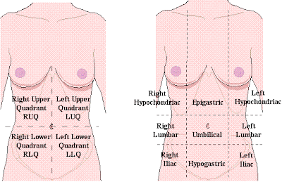 ဒီေတာ့ ဗိုက္နဲ့ပါတ္သက္ျပီး တည္ေနရာ အေနအထား နဲ့ သူ ့အတြင္းဖက္က အစိပ္အပိုင္းေတြကို လြယ္လြယ္ သိရေအာင္ ဗိုက္တျပင္ကို အကြက္ ၄ ကြက္ အၾကမ္းဖ်င္း ခြဲျခား သတ္မွတ္ထားပါတယ္။ ပံုမွာျပထားသလို အေပၚ၊ ေအာက္၊ ဘယ္၊ ညာ ဆိုျပီး ခြဲထားတဲ့အတြက္ Left Upper Quadrant (LUQ), Left Lower Quadrant (LLQ), Right Upper Quadrant (RUQ), and Right Lower Quadrant (RLQ).လို့ ေရးသားၾကပါတယ္ ။